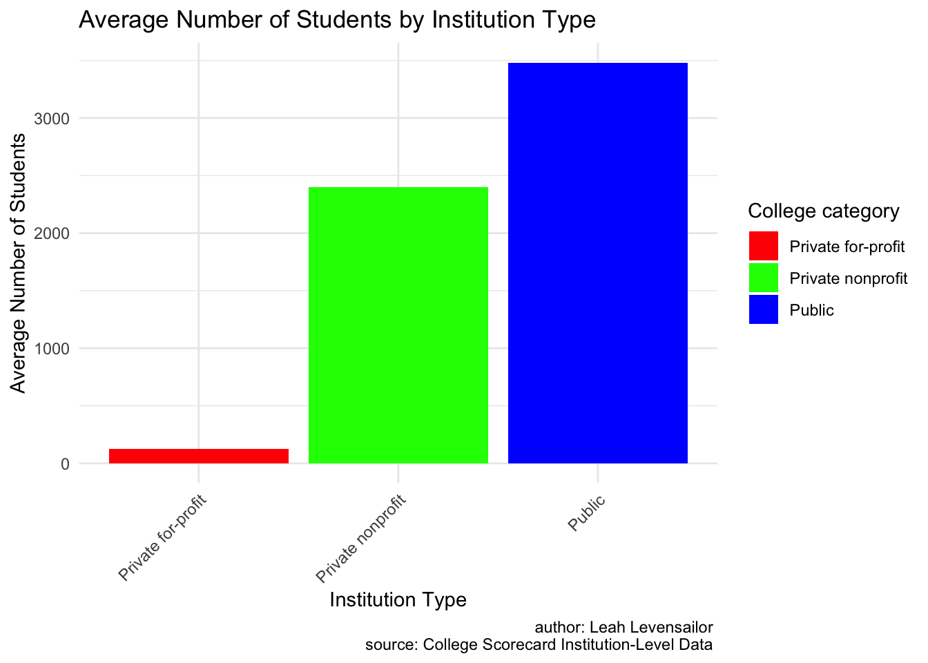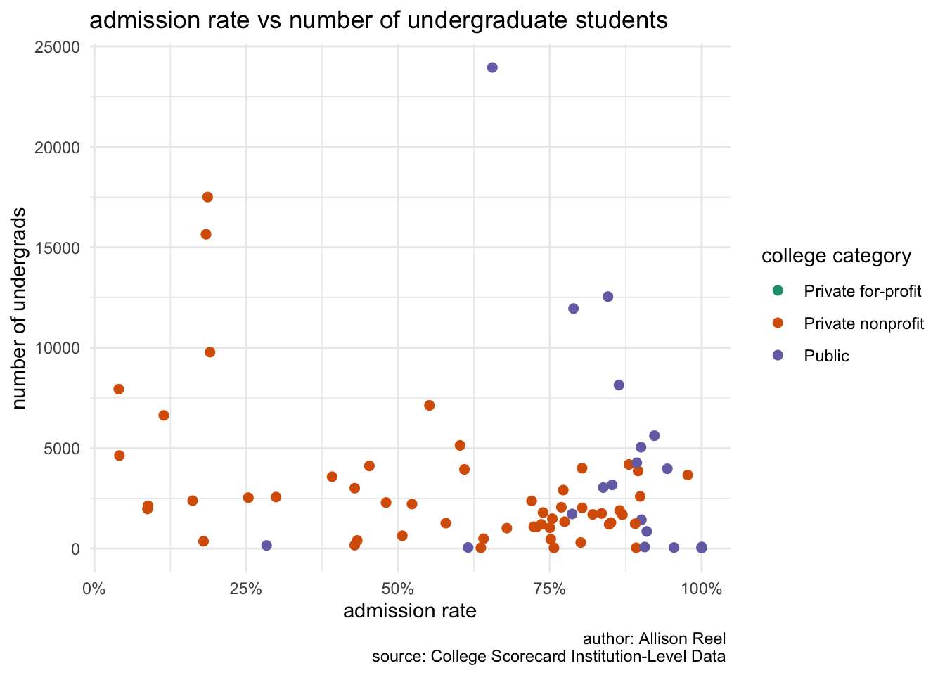 Our first plot looks at the relationship between average number of students and type of institution. The graph is split into three separate bars for each institution type: public, private non-profit, and private for-profit. We can conclude from this graph that typically the public institutions in Massachusetts have a higher number of students with an average of 3480 students per institution. The outlier is the Private For-Profit average number of students with 151 students. This number is brought down by the smaller specialized schools such as Empire Beauty School-Boston with only 87 people in the undergraduate population. The public universities in this graph don’t show a great discrepancy between the public and private non-profit institutions but in reality, there is such a large gap between the largest and smallest number of students in all of the public universities. The average is brought down by all of the smaller public schools. Our second plot looks at the relationship between admissions rate and number of undergraduate students, colored by the status of private, non profit, and public institutions. From this graph, we observe that for public institutions, the vast majority have a very high admission rate but hover around an average number of undergraduate students enrolled. This implies that public colleges/universities are relatively popular, as they admit a large number of students while having an average number of undergraduates enrolled. For private institutions, they are evenly spread along the admission rate, while remaining comparable numbers of undergraduate enrollment. We conclude from this information that since these colleges and universities have a similar number of undergraduates as public institutions, but often lower admission rates, they are more popular than public institutions.